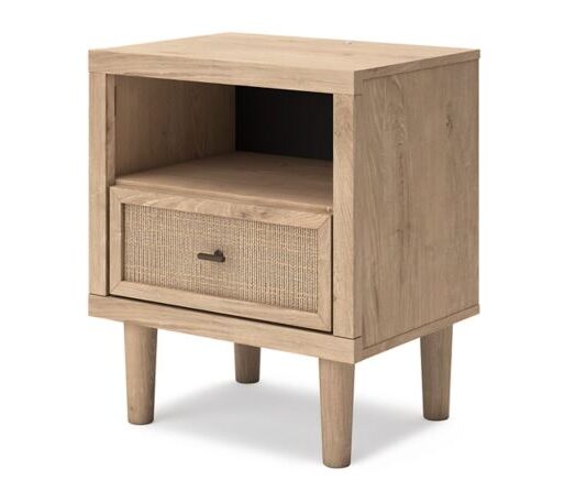 Clean-lined and contemporary—but far from stark—this nightstand is a fresh style awakening. Pairing a light finish with replicated oak grain and textured beige details that replicate the look of cane, its mixed materials bring a naturally versatile vibe to your bedroom. Sleek, simple hardware plays perfectly with the modern aesthetic. A smooth-gliding drawer and USB charging keep your clutter contained and your gadgets powered.